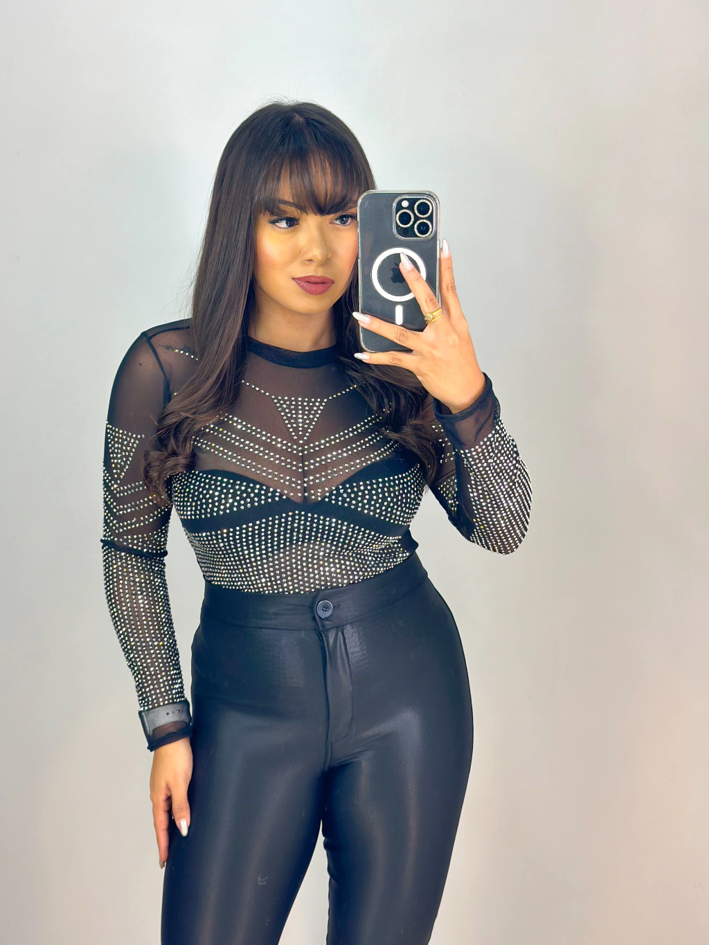 Body no tecido tule proporcionando e encaixe perfeito ao corpo, possui aplicação de hotfix (strass) em toda extensão da peça, manga longa e possui fecho embaixo faciltando o uso e a retirada. Essa é aquela peça perfeita para compor looks glamoroso com bastante estilo e originalidade.