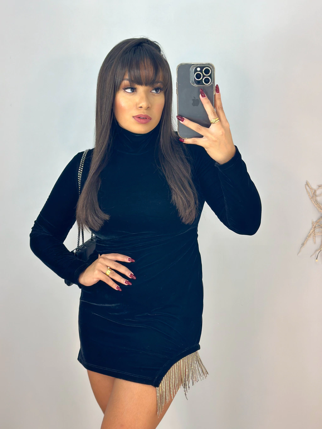 Vestido manga longa confeccionado no veludo, possui gola alta e sem bojo, fechamento na parte de trás em botões acrílico prateado, comprimento curto com modelagem estilo tubinho, aplicação na lateral em franjas com strass tornando um look espetácular. Vestido super elegante e bem moderno com um lindo detalhe costa nua, extremamente confortável flexivel e que ajusta super bem no corpo
